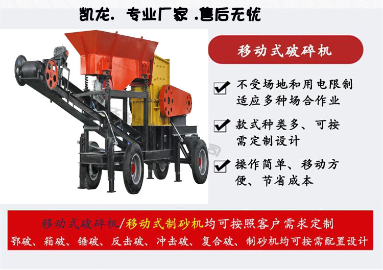 廠家直銷大口徑移動式破碎站,對玄武巖、花崗巖、石灰?guī)r、鵝卵石、青石、金礦石、鐵礦石、煤矸石、建筑垃圾等均有良好粉碎效果,經(jīng)上百家用戶使用設備后,反映良好,采購回頭率高達50%,讓設備效果說話,我廠設備質(zhì)量可靠,售后服務完善,讓您買的放心!用的舒心!
